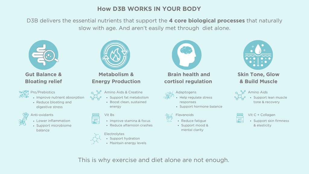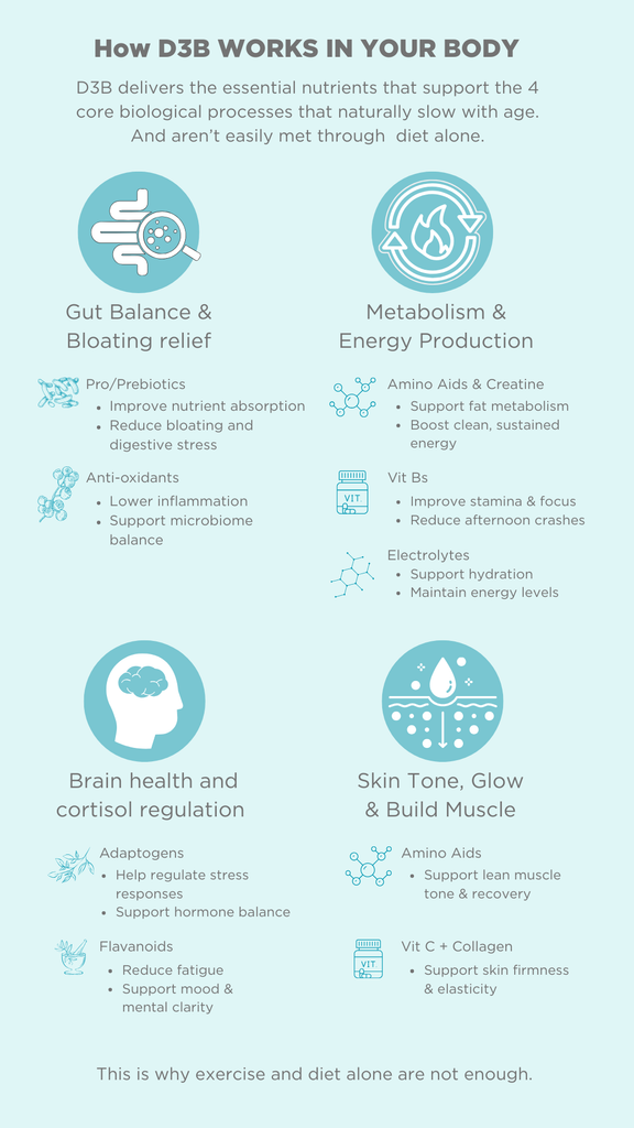 D3B blends 39 evidence-backed nutrients across 9 supplementation groups to support the real things women feel the most: